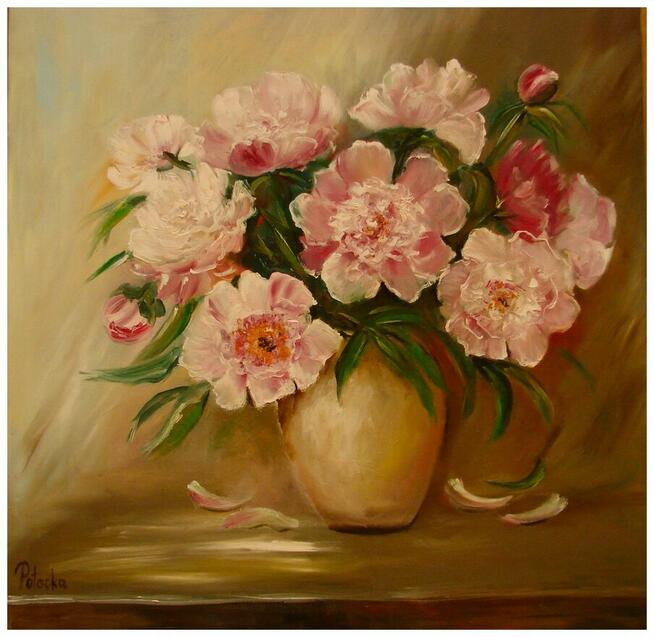 Obraz przedstawia bukiet różowych piwonii w białym wazonie. Kwiaty są pełne, a ich płatki zdają się być miękkie i ...